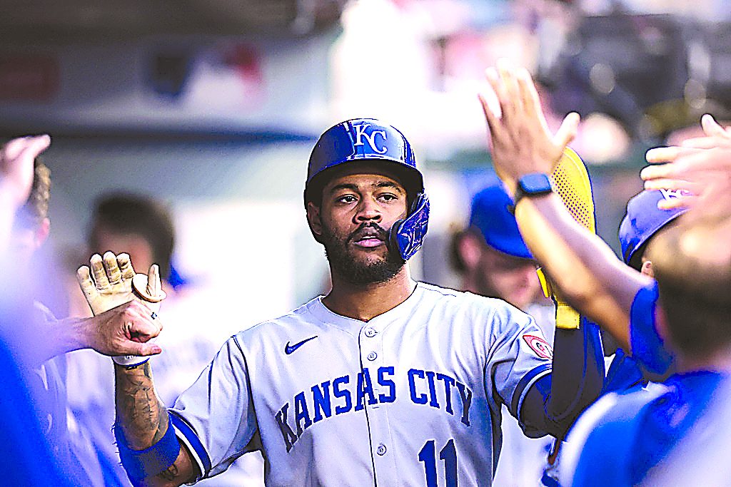 FILE - Kansas City Royals' Maikel Garcia (11) high-fives teammates after scoring a run during the first inning of a baseball game against the Los Angeles Angels Tuesday, Sept. 23, 2025, in Anaheim, Calif. (AP Photo/Eric Thayer, File)