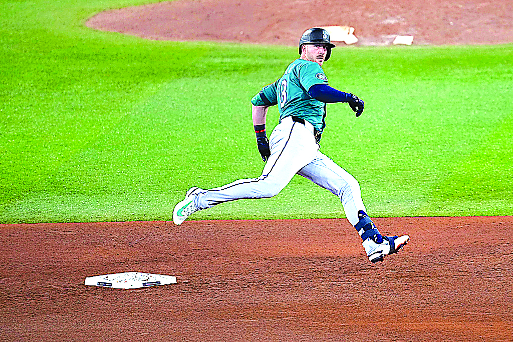 Seattle Mariners' Mitch Garver runs out a pinch hit triple against the Toronto Blue Jays during the sixth inning in Game 2 of baseball's American League Championship Series, Monday, Oct. 13, 2025, in Toronto. (AP Photo/David J. Phillip)