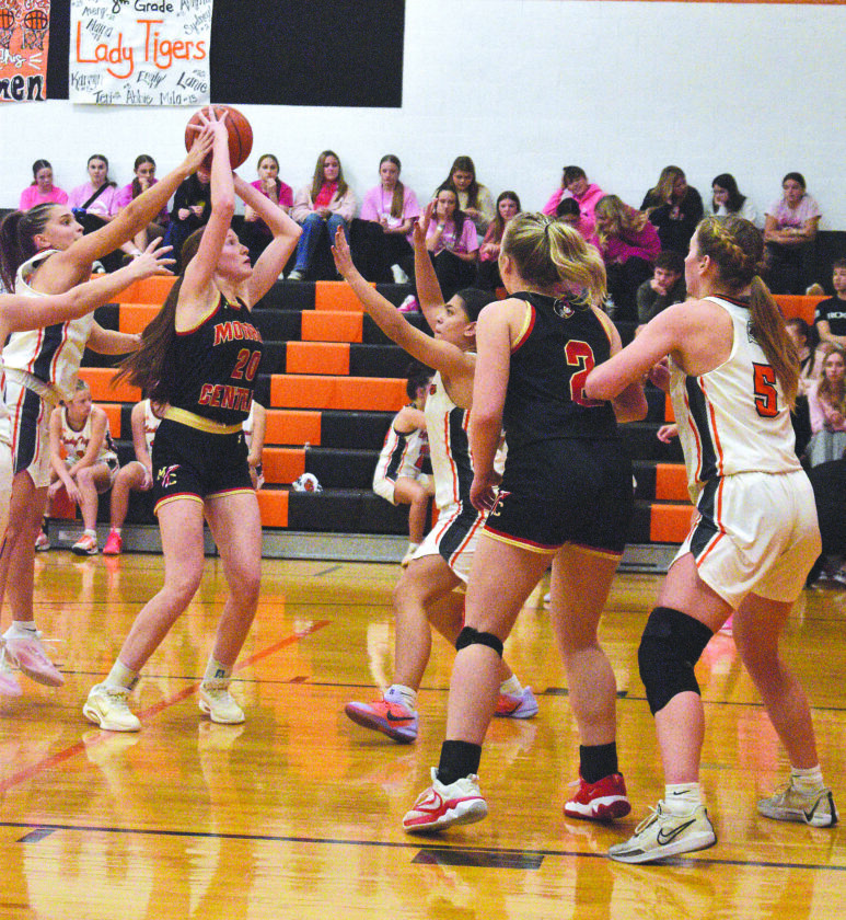 Photo by Kim North Monroe Central’s Brylee McFrederick (20) shoots for two of her game-high 16 points Monday night. Defending from behind is Shadyside’s Cam Kolvek, while the Seminoles’ Alli McFrederick (2) and the Tigers’ Kaci Tsoras (5) look on. Monroe Central improved to 2-0 with a 69-33 win.