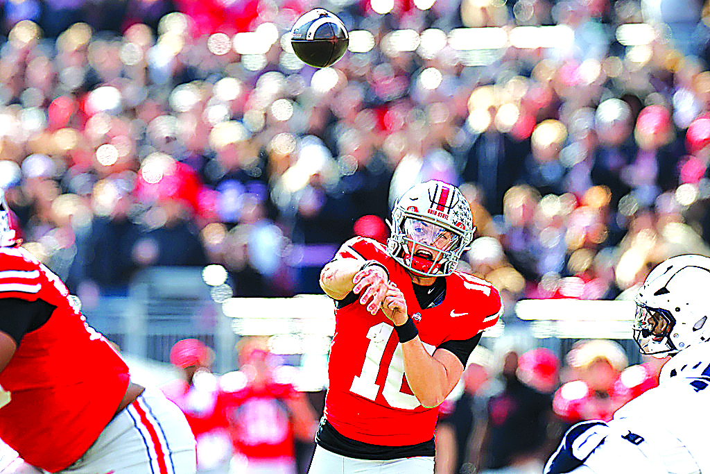 Sayin had three completions of at least 40 yards, including a pair to Carnell Tate, who finished with five catches for 124 yards. Sayin connected with Tate on a go route for a 45-yard TD midway through the second quarter to extend the Buckeyes’ lead to 17-7.