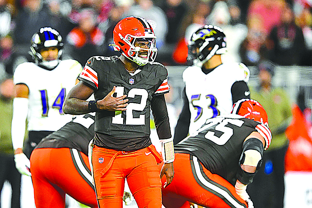 Cleveland Browns quarterback Shedeur Sanders (12) signals at the line of scrimmage in the second half of an NFL football game against the Baltimore Ravens in Cleveland, Sunday, Nov. 16, 2025. (AP Photo/David Richard)