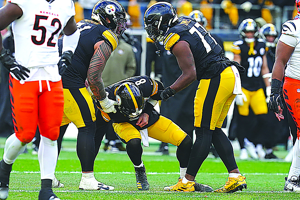 Pittsburgh Steelers quarterback Aaron Rodgers (8) is helped up off the field after a hit by the Cincinnati Bengals during the first half of an NFL football game Sunday, Nov. 16, 2025, in Pittsburgh. (AP Photo/Matt Freed)