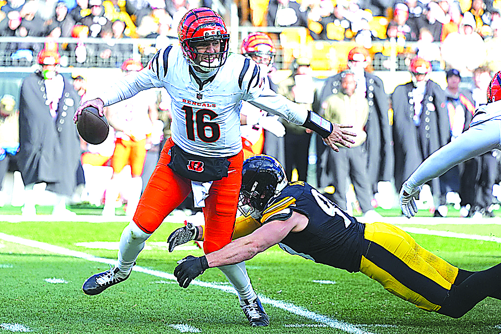 Cincinnati Bengals quarterback Joe Flacco (16) avoids a tackle by Pittsburgh Steelers linebacker T.J. Watt (90) during the first half of an NFL football game Sunday, Nov. 16, 2025, in Pittsburgh. (AP Photo/Gene J. Puskar)