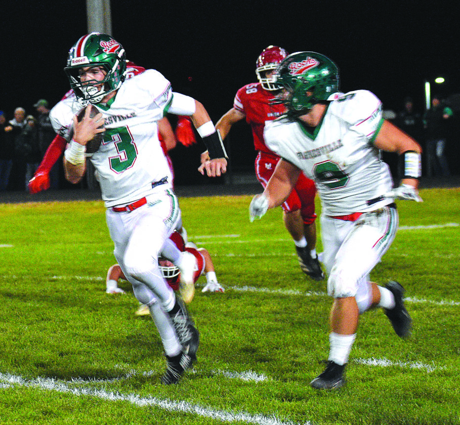 File Photo By Kim North Barnesville’s Evan Wells (3) runs with the ball from a game earlier this season as teammate Koby Jones (9) looks for a block. Wells had a 42-yard run that set up a touchdown Friday night, but the Shamrocks had their season ended by Wheelersburg, 36-13, in the Ohio Division V, Region 19 semifinals.