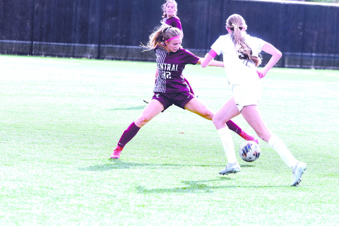 Photo Provided Wheeling Central freshman defender Maddie Steele challenges the ball during the second half of Friday’s Class AA-A West Virginia Secondary Schools Activities Commission State Soccer Championship match against Lincoln High School.