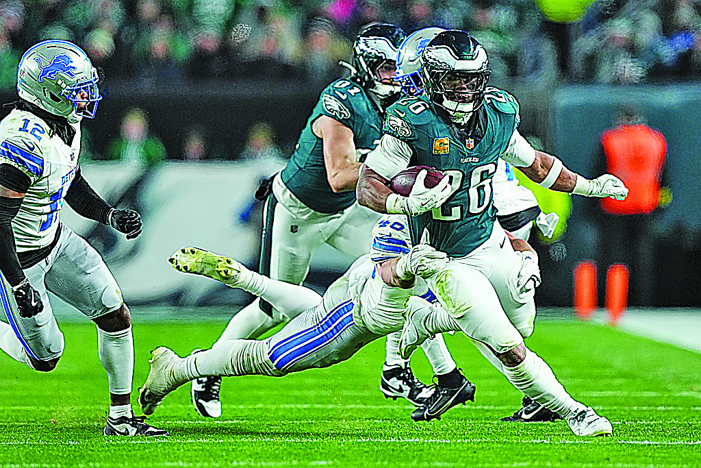 Philadelphia Eagles running back Saquon Barkley (26) is tripped up by Detroit Lions linebacker Jack Campbell (46) during the second half of an NFL football game Sunday, Nov. 16, 2025, in Philadelphia. (AP Photo/Matt Rourke)