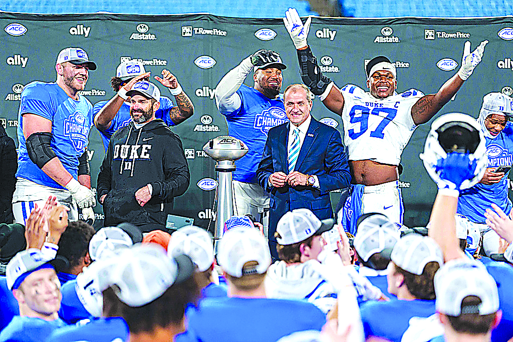 Duke players celebrate with the trophy after defeating Virginia in the Atlantic Coast Conference championship NCAA college football game Saturday, Dec. 6, 2025, in Charlotte, N.C. (AP Photo/Jacob Kupferman)