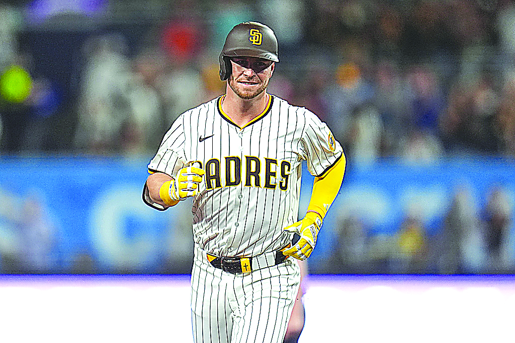 FILE - San Diego Padres' Ryan O'Hearn celebrates after hitting a grand slam during the first inning of a baseball game against the Milwaukee Brewers, Sept. 23, 2025, in San Diego. (AP Photo/Gregory Bull, File)