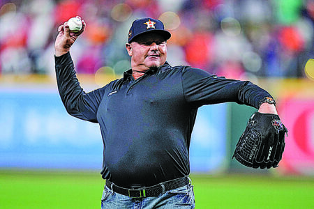 - FILE – Houston Astros player Roger Clemens throws out the ceremonial pitch ahead of Game 1 of baseball’s American League Championship Series between the Houston Astros and the New York Yankees, Oct. 19, 2022, in Houston. (AP Photo/Kevin M. Cox, File)