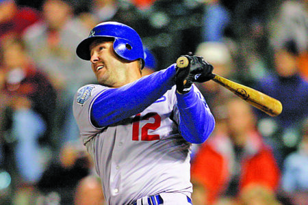 - FILE – Los Angeles Dodgers Jeff Kent hits a two-run home run against the San Francisco Giants in the fourth inning of a baseball game in San Francisco, Sept. 26, 2008. (AP Photo/Jeff Chiu, File)
