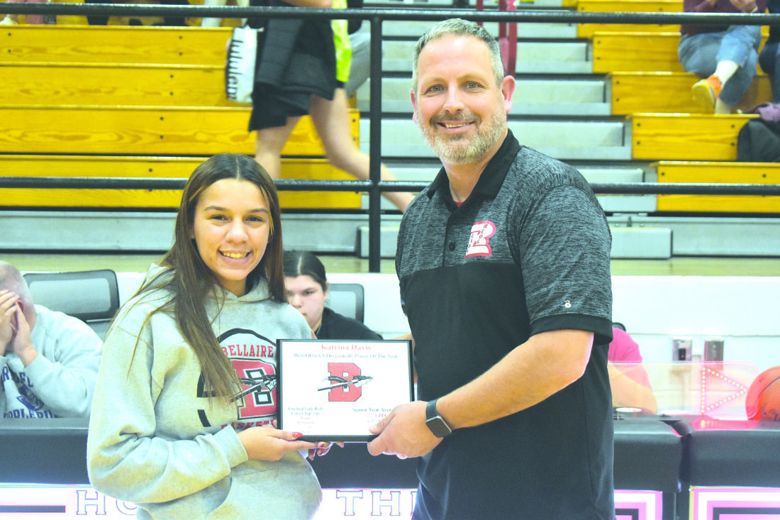 Photo by Kim North Katrina Davis, left, is presented with a plaque from Bellaire girls’ basketball head coach John Farrier earlier this week. Davis was the Ohio Division III Player of the Year in 2020 and didn’t have the chance to be recognized due to the COVID-19 pandemic.
