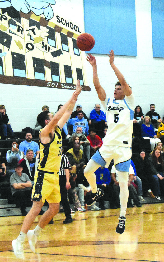 Photo by Kim North Bridgeport’s Jaleel Vincent (5) shoots over top of Magnolia’s Finn Loy during Friday night action from Frank Baxter Court inside the John J. Havlicek Gymnasium in Bridgeport. Vincent led a stunning comeback for the Bulldogs with 26 points. They won, 54-50.