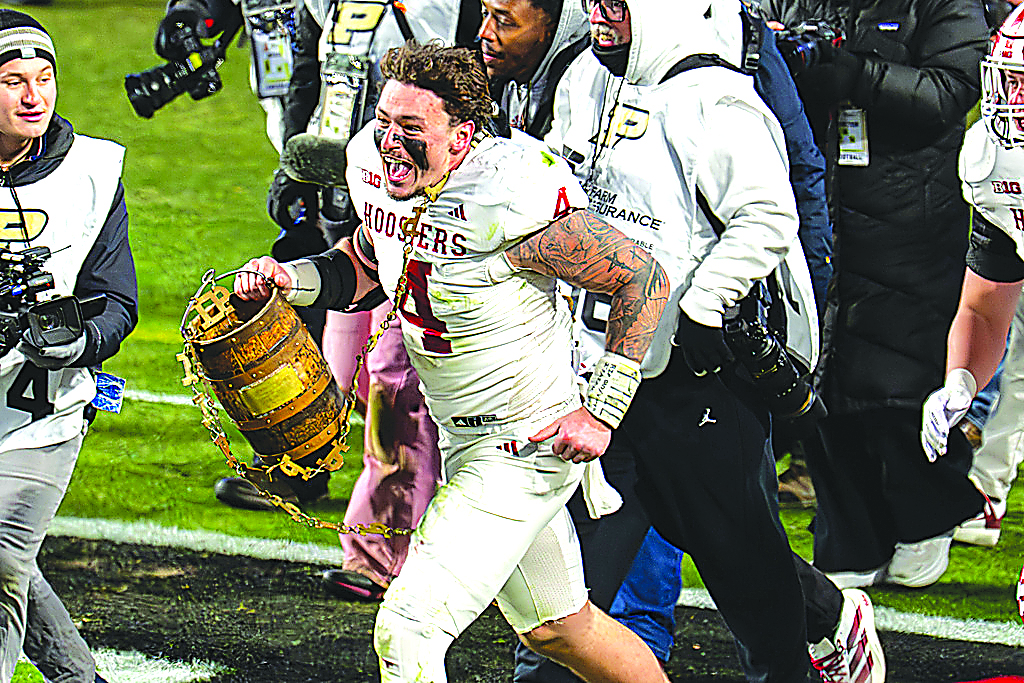 Indiana linebacker Aiden Fisher (4) celebrates with the Old Oaken Bucket trophy after an NCAA college football game against Purdue, Friday, Nov. 28, 2025, in West Lafayette, Ind. (AP Photo/Doug McSchooler)