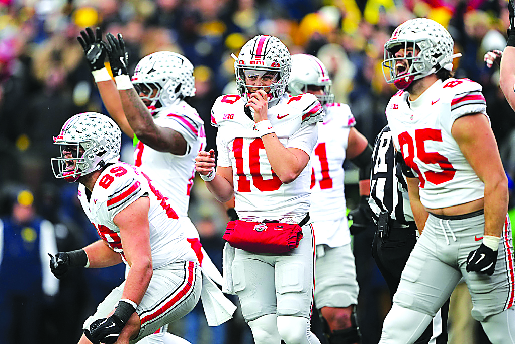 Ohio State quarterback Julian Sayin, center, celebrates near tight ends Will Kacmarek, left, and Bennett Christian after scoring a touchdown during the first half of an NCAA college football game against Michigan, Saturday, Nov. 29, 2025, in Ann Arbor, Mich. (AP Photo/Ryan Sun)