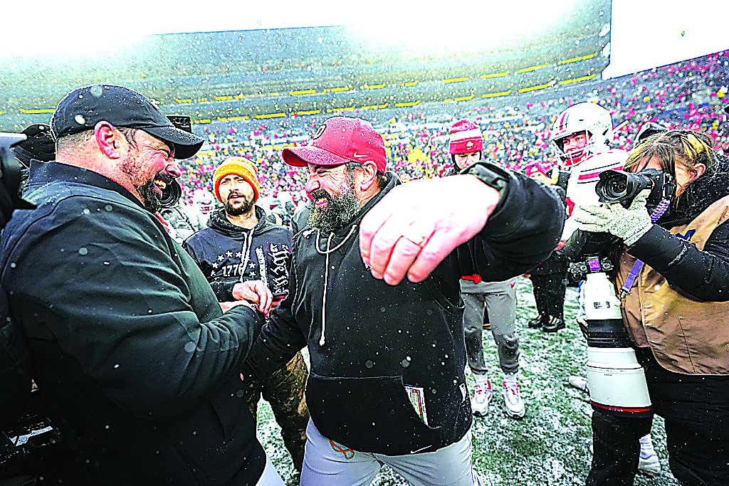Ohio State Buckeyes head coach Ryan Day, left, celebrates with defensive coordinator Matt Patricia after the team's win against Michigan in an NCAA college football game, Saturday, Nov. 29, 2025, in Ann Arbor, Mich. (AP Photo/Ryan Sun)