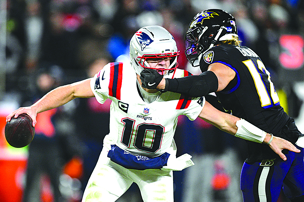 New England Patriots quarterback Drake Maye (10) is pressured by Baltimore Ravens safety Alohi Gilman (12) during the second half of an NFL football game, Sunday, Dec. 21, 2025, in Baltimore. (AP Photo/Nick Wass)