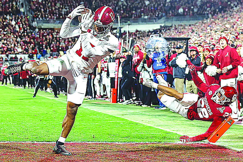 Alabama wide receiver Lotzeir Brooks (17) makes a touchdown catch against Oklahoma during the second half in the first round of an NCAA College Football Playoff, Friday, Dec. 19, 2025, in Norman, Okla. (AP Photo/Alonzo Adams)