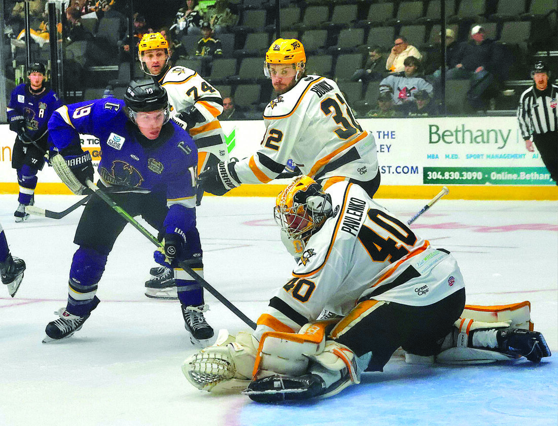 Photo by Joe Lovell Wheeling Nailers goaltender Maxime Pavlenko (40) reaches for a save as Greensboro’s Eric Leyh (19) drives towards the net while the Nailers’ Tommy Budnick (32) looks on during Friday night’s game inside WesBanco Arena.