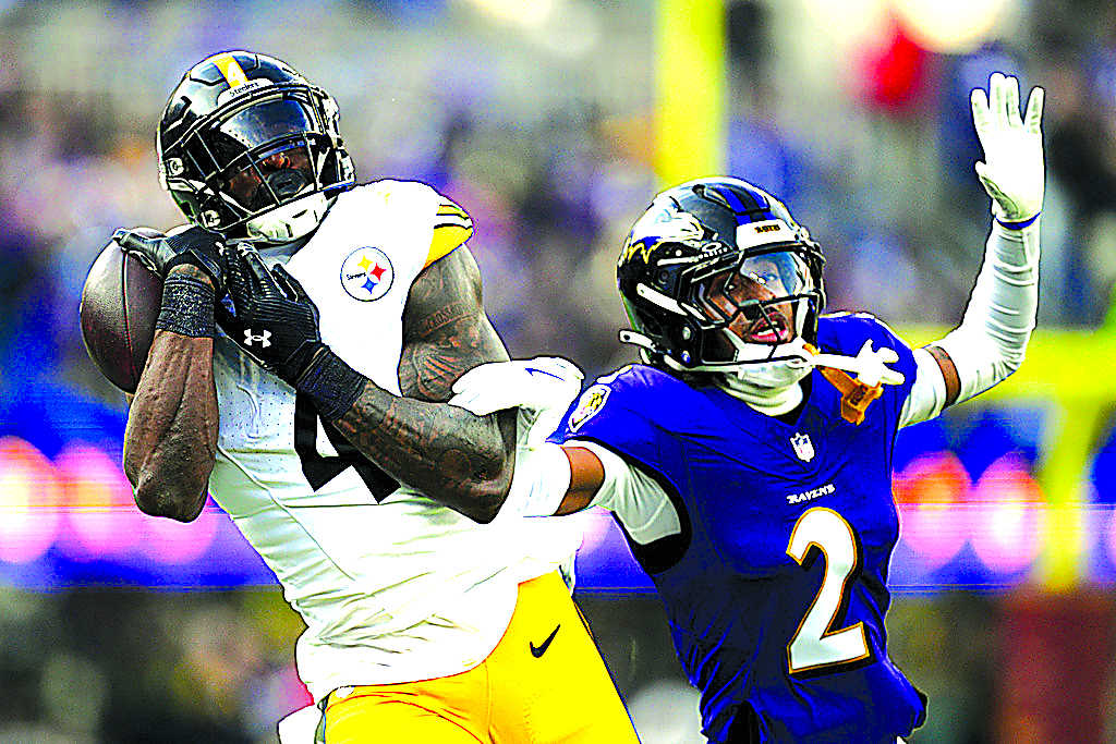 Pittsburgh Steelers wide receiver DK Metcalf (4) catches a pass against Baltimore Ravens cornerback Nate Wiggins (2) during the first half of an NFL football game, Sunday, Dec. 7, 2025, in Baltimore. (AP Photo/Nick Wass)