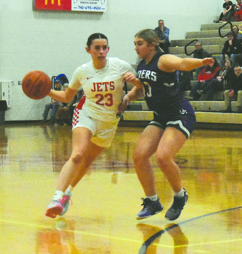 Photo by Kim North Union Local’s Myah Martin (23) dribbles against the pressure of Martins Ferry’s Makayla Cole during the second half of Thursday night’s contest in Morristown. The Jets won, 57-51.