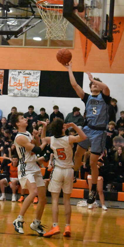 Bridgeport’s Jaleel Vincent floats along the baseline for two of his 18 points as Shadyside’s Jayden Johnson (20) and Bryce Sloan (5) defend. The Bulldogs used a strong second half for a 73-61 victory Saturday inside a packed Tigers Den. (Photo by Kim North)