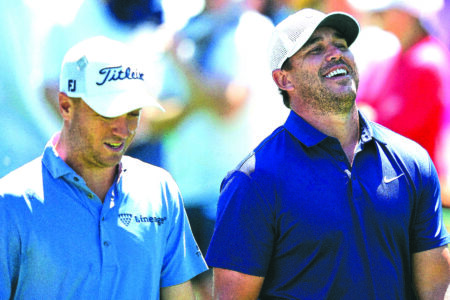 FILE - Brooks Koepka laughs while talking with Justin Thomas, left, on the 15th fairway during a practice round at the Masters golf tournament, Tuesday, April 8, 2025, in Augusta, Ga. (AP Photo/Matt Slocum, File)