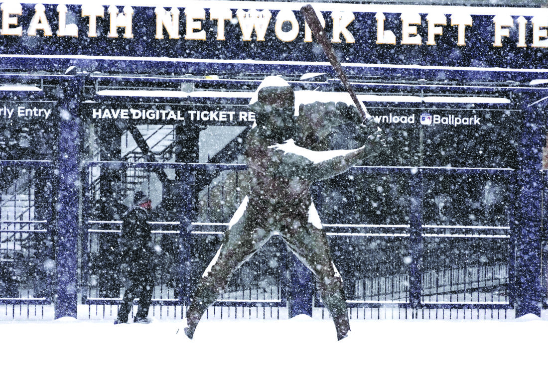 A man walks past a statue of Pittsburgh Pirates baseball Hall of Fame Willie Stargell outside PNC Park on the Northside of Pittsburgh at mid-morning Sunday, Jan. 25, 2026. (AP Photo/Gene J. Puskar)