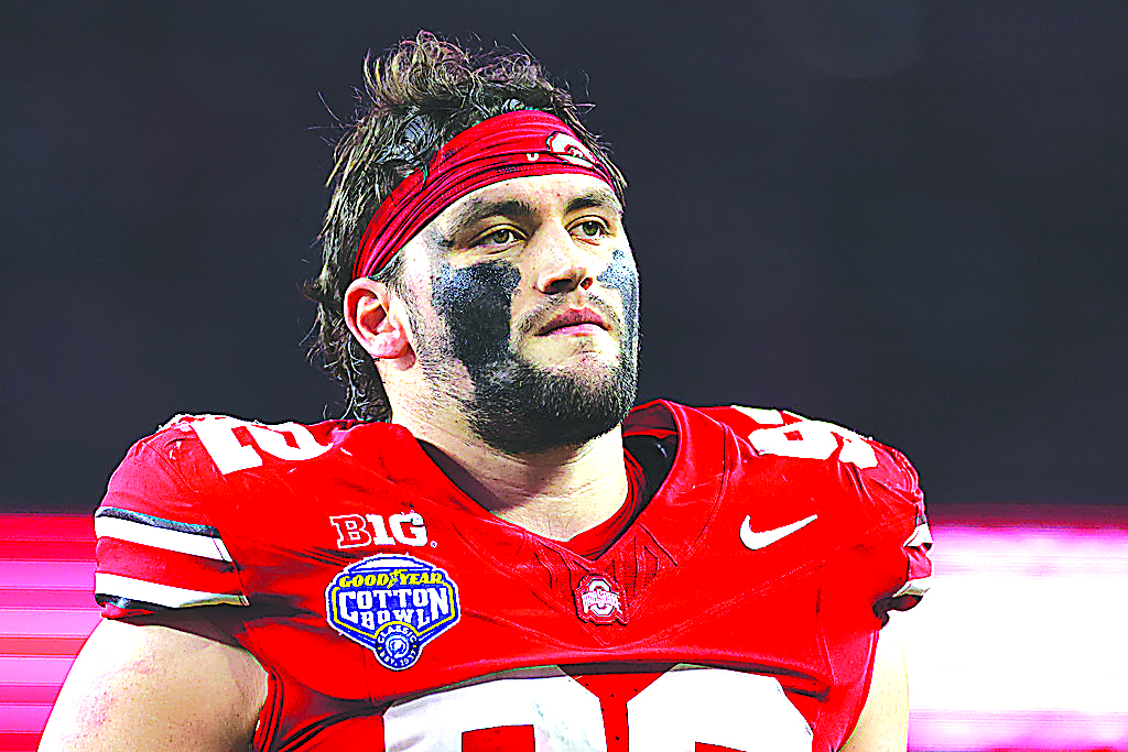 Ohio State defensive end Caden Curry looks on during the first half of the Cotton Bowl College Football Playoff quarterfinal game against Miami Wednesday, Dec. 31, 2025, in Arlington, Texas. (AP Photo/Gareth Patterson)