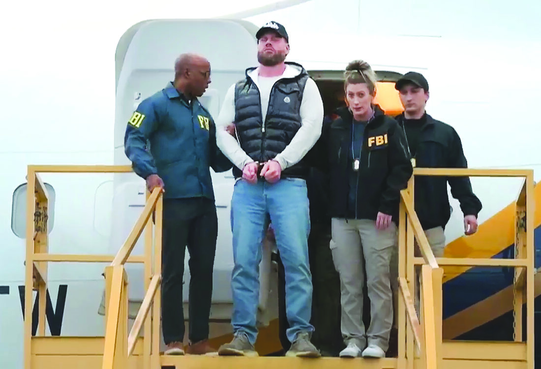This still photo taken from video and provided by the FBI shows Ryan Wedding a former Canadian Olympic snowboarder facing charges related to drug trafficking and the killing of a federal witness is taken off a plane at Ontario International Airport in Ontario, Calif. on Friday, Jan. 23, 2026. (FBI via AP)