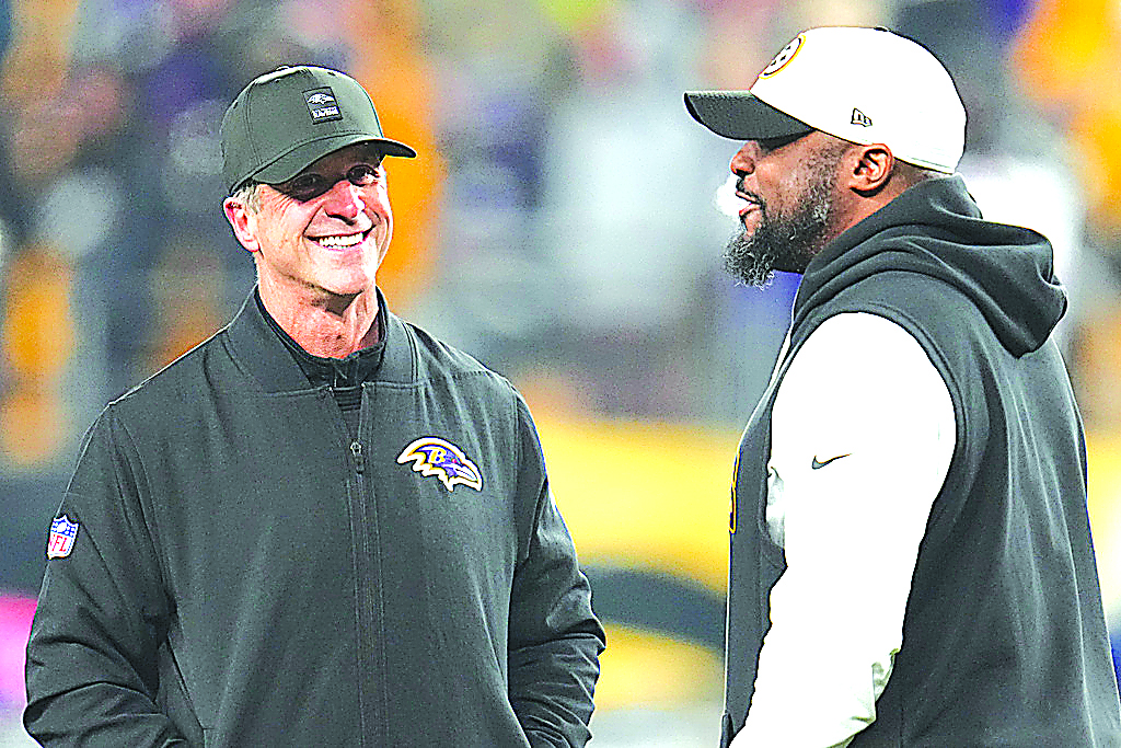 Baltimore Ravens head coach John Harbaugh, left, and Pittsburgh Steelers head coach Mike Tomlin, right, talk before an NFL football game Sunday, Jan. 4, 2026, in Pittsburgh. (AP Photo/Gene J. Puskar)