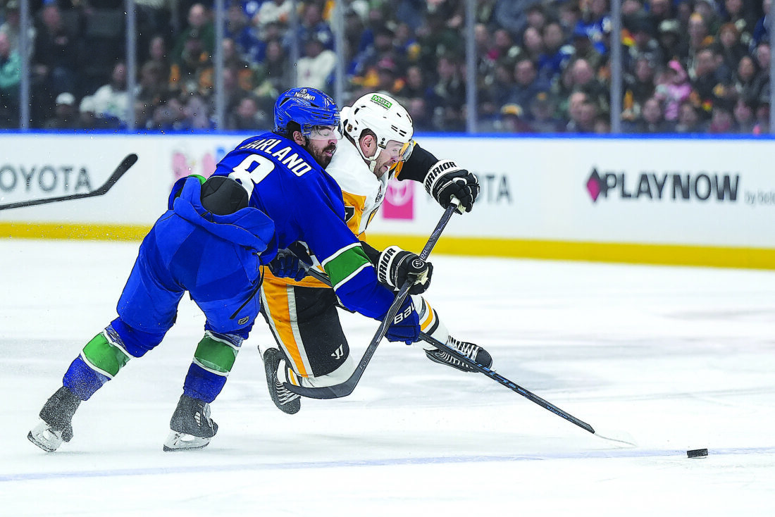 Vancouver Canucks' Conor Garland, left, and Pittsburgh Penguins' Bryan Rust, right, collide during first-period NHL hockey game action in Vancouver, British Columbia, Sunday, Jan. 25, 2026. (Darryl Dyck/The Canadian Press via AP)