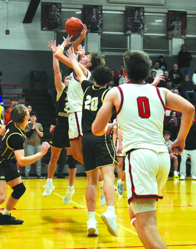 Photo by Kim North St. Clairsville’s Griffin Straub powers his way to the basket between John Marshall defenders Cain Martin (3) and Kayden Knapp (20) during Tuesday night’s game on John Jenkins Court inside St. Clairsville High School. Also pictured are John Marshall’s Preston Watkins, left, and St. Clairsville’s Niko Jacob (0). Straub scored 30 points and Jacob added 21 in an 85-74 victory.