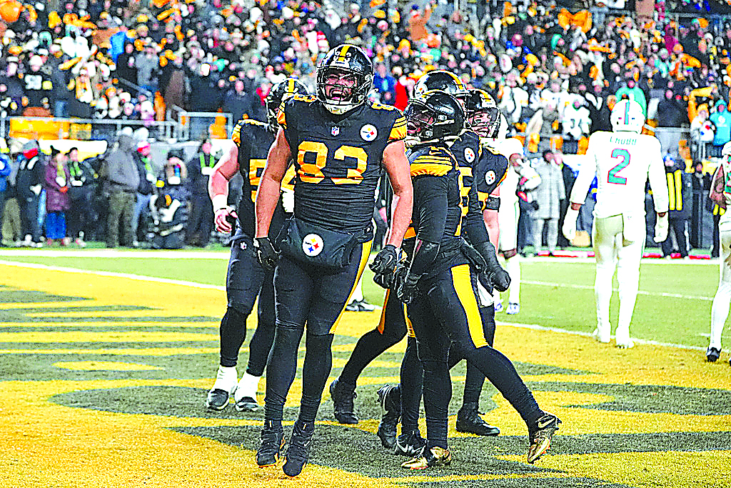 Pittsburgh Steelers tight end Connor Heyward (83) celebrates his touchdown run in the first half of an NFL football game against the Miami Dolphins in Pittsburgh, Monday, Dec. 15, 2025. (AP Photo/Gene J. Puskar)