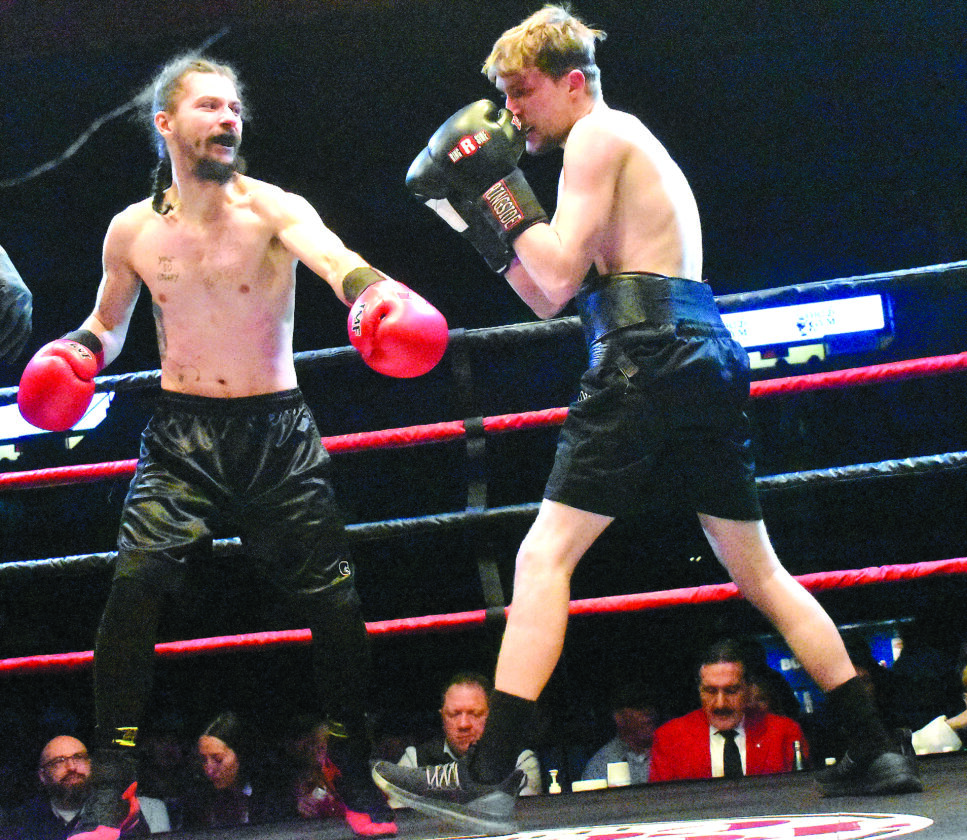 Moundsville’s Freddy “The Hitman” Hicks, right, squares off with Wheeling’s Dillan “The Mailman” Crow during their lightweight bout during Friday night’s 45th annual Ohio Valley Toughman Contest inside downtown Wheeling’s WesBanco Arena. Hicks won a split decision.