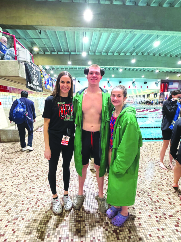 Photo Provided From left, Barnesville head swim coach Danielle Anderson, junior Antoni Schuerle, and sophomore Liv McCrate, pictured Thursday at the OHSAA State Swim and Diving Meet inside Canton’s C.T. Branin Natatorium.