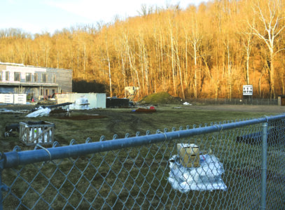 Due to ongoing construction of the multi-million dollar addition – dubbed “The Bridge” – on the Bridgeport Exempted Village School District campus, all home softball games – usually played at Irene Ehni Memorial Field – will be played at the Mead Township Field in Shadyside. Equipment and materials can be seen pictured in the outfield late last week.