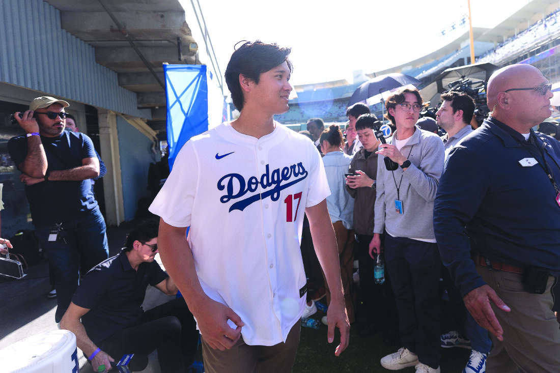 Los Angeles Dodgers two-way player Shohei Ohtani leaves after talking to reporters during DodgerFest at Dodger Stadium in Los Angeles, Saturday, Jan. 31, 2026. (AP Photo/Jae C. Hong)