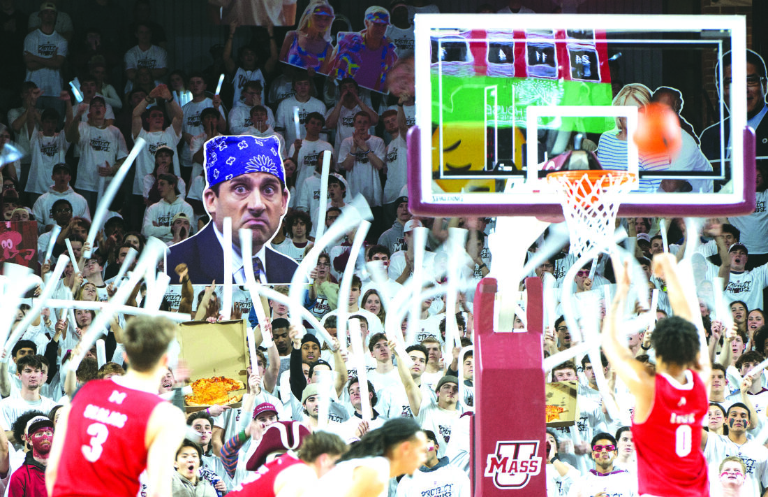 The Massachusetts student section cheers as Miami Ohio wing Eian Elmer (0) attempts a free throw during the NCAA basketball game at The Mullins Center in Amherst, Mass., Tuesday, Feb. 17, 2026. (Daniel Jacobi II/The Daily Hampshire Gazette via AP)