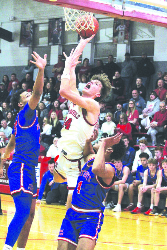 Photo by Nick Henthorn St. Clairsville’s Griffin Straub slashes in for a layup attempt Tuesday during the Red Devils’ home victory against Wheeling Park on Tuesday on Senior Night.