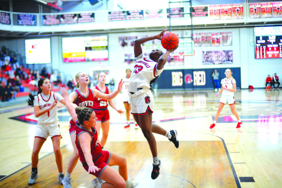 Photo by Andrew Grimm Steubenville’s Nylah McShan goes in for a layup against Dover during Big Red’s district quarterfinal game Saturday inside the Crimson Center.