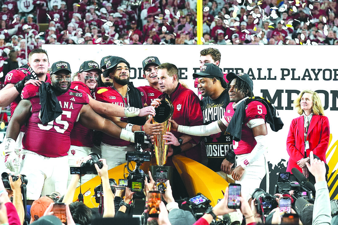 FILE - Indiana head coach Curt Cignetti, third from right, stands with players and the trophy after Indiana defeated Miami in a College Football Playoff national championship game, Jan. 19, 2026, in Miami Gardens, Fla. (AP Photo/Lynne Sladky, file)