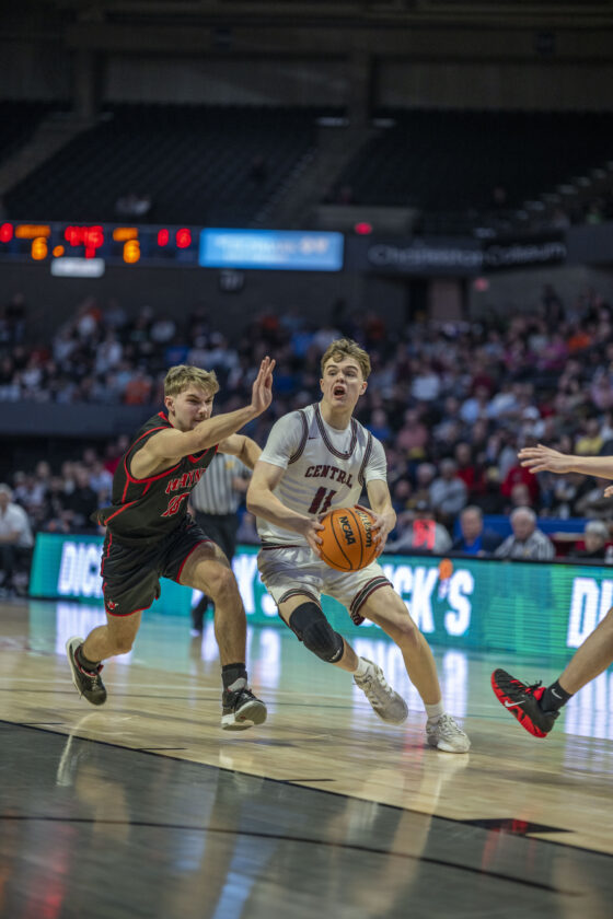 Wheeling Central's Eli Sancomb drives to the basket during the Maroon Knights' Class AA semifinal against Wayne on Friday inside the Charleston Coliseum.