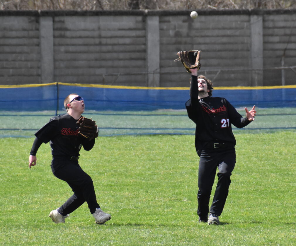 Photo by Kim North Shadyside centerfielder Ryan Collins watches the ball come down as left fielder Nathan Beck closes in. The two eventually collided, but Collins held onto the ball for the out during Saturday’s game against Bridgeport on the Niekro Diamond in Brookside. The Tigers won, 3-2.