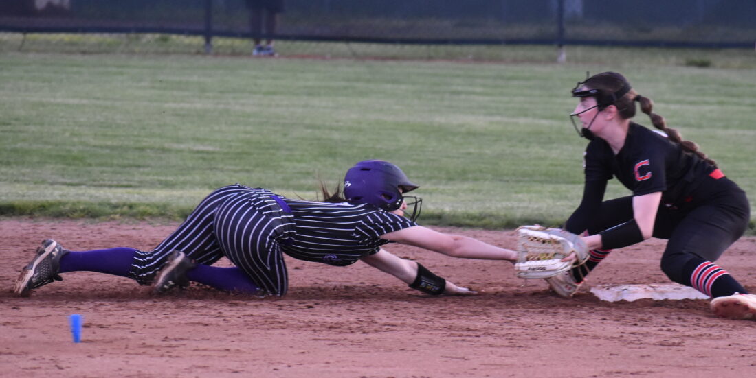 Photo by Kim North Martins Ferry’s Malena Catalano dives safely back into second base during Tuesday night’s OVAC Class 3A semifinal against Columbiana on Ben’s Field at the I-470 J.B. Chambers Complex in Elm Grove. The Purple Riders advanced to their sixth consecutive championship game with a 12-3 victory over the Clippers.