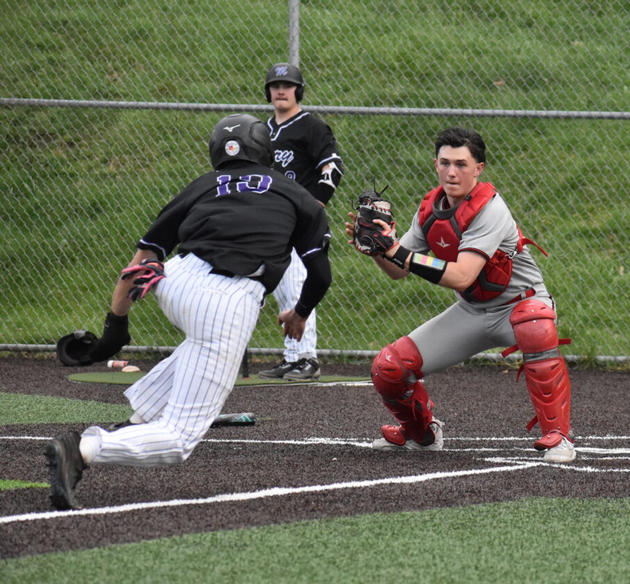 Photo by Kim North St. Clairsville catcher Landon Stack waits on Martins Ferry’s Eli Smith at the plate in the top of the sixth inning Thursday at Memorial Park. Smith tried to score from third on a fly out to right but was thrown out by Rowan Mellott. The Purple Riders won a slugfest, 11-9.