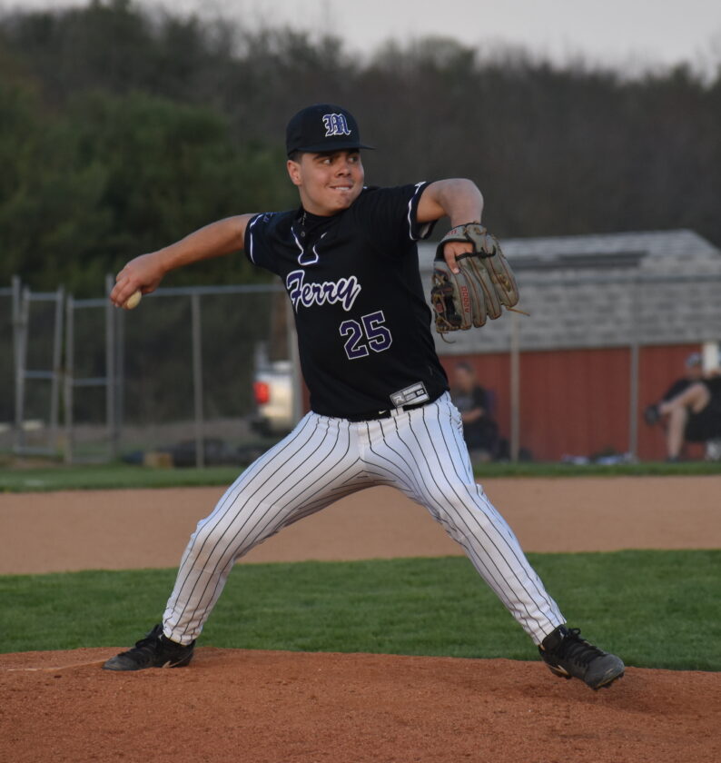 Photo by Kim North Martins Ferry’s Colby Kropka delivers a pitch plateward during Thursday night’s game with Union Local in Morristown. The junior came on in relief in the third inning and went the distance as the Purple Riders rallied for a 4-3 victory over the Jets.