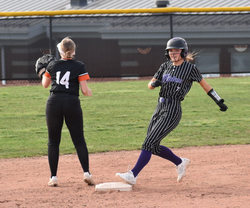 Photo by Kim North Martins Ferry’s Gracie Lucas (7) pulls into second after smashing a three-run double in a five-run second inning Tuesday night against Linsly. She finished with four RBI in the Purple Riders’ 10-0 victory over the cadets in four-and-a-half innings.