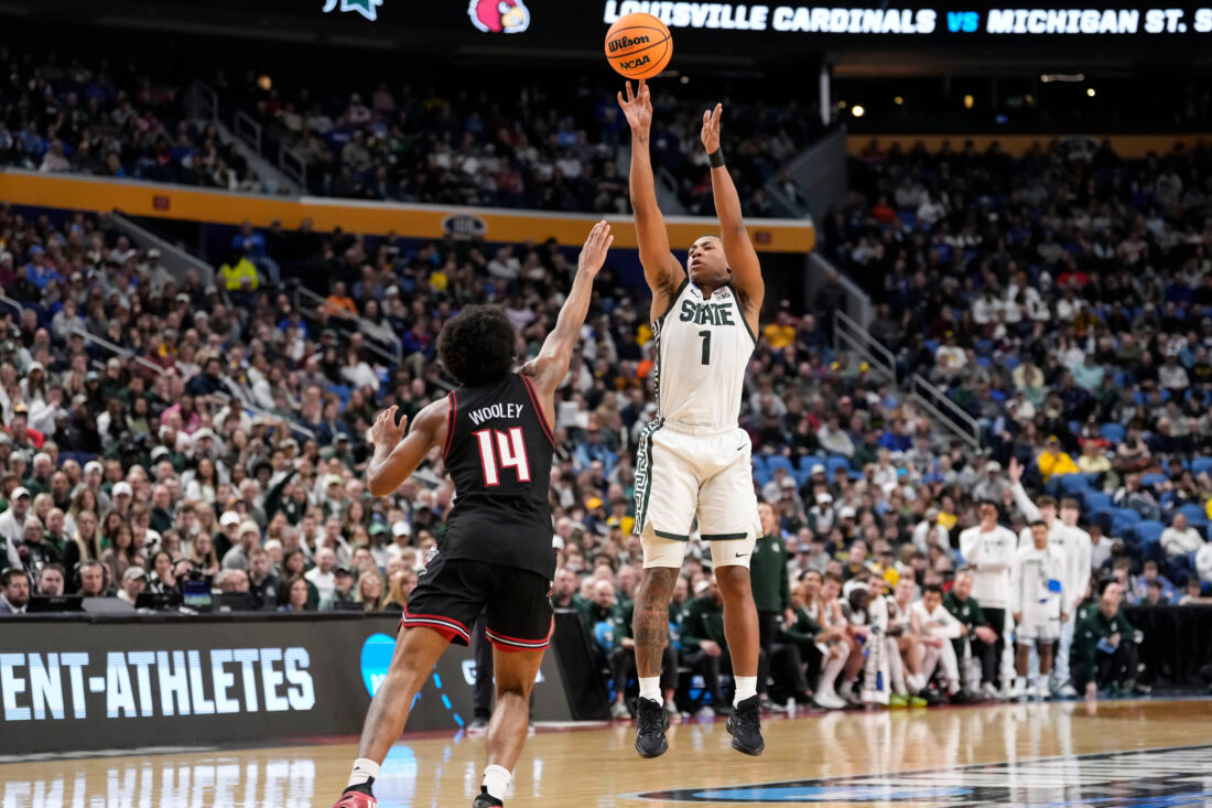 Michigan State guard Jeremy Fears Jr. (1) shoots a 3-pointer over Louisville during the first half in the second round of the NCAA college basketball tournament, Saturday, March 21, 2026, in Buffalo, N.Y. (AP Photo/Yuki Iwamura)