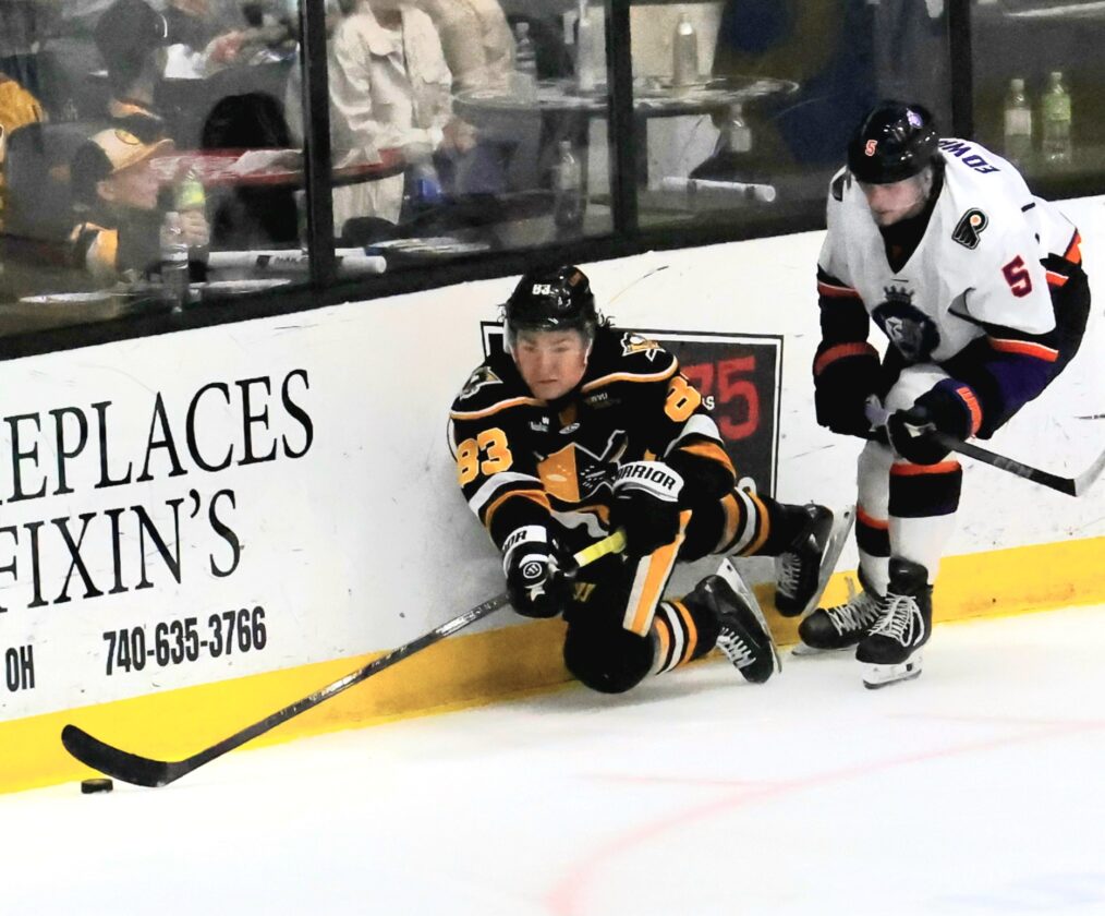 Wheeling made it 2-0 just over five minutes into the second period as Ryan McAllister also scored on a back-handed rebound. Connor Lockhart’s one-timer from the left circle was turned aside by Petruzzelli, but McAllister was in the right spot at the right time, sending the rubber disc between the goalie’s legs to light the lamp. Emil Pieniniemi had a helper.