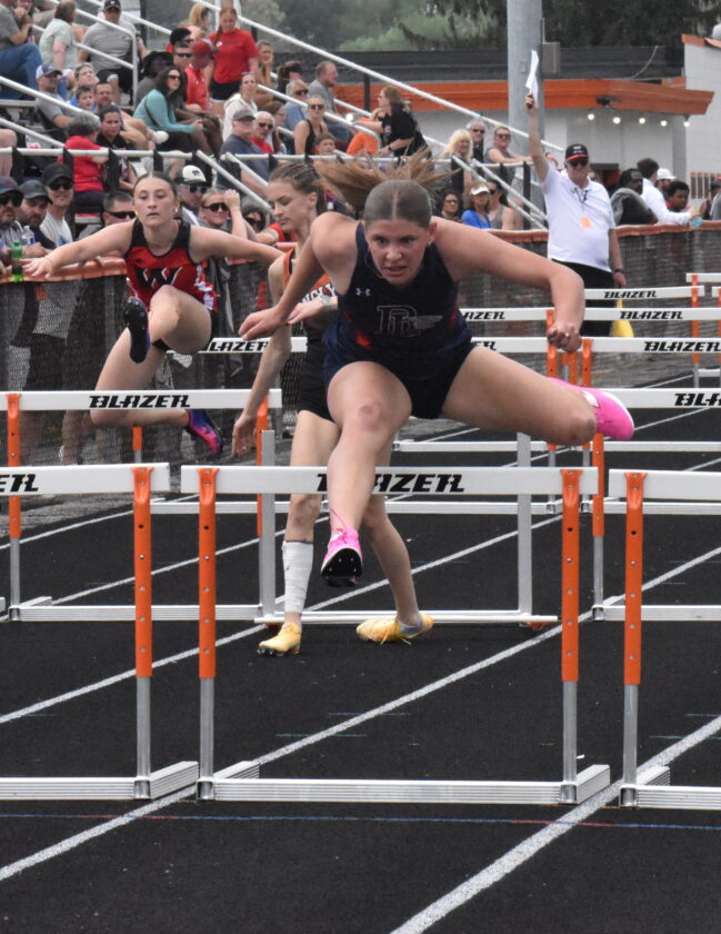 Photo by Kim North Buckeye Local’s Jenna Delvecchio completes the final hurdle en route to her championship in the 110 Highs Saturday during the 55th annual Shadyside Relays at Fleming Field. She also won the 300 lows.